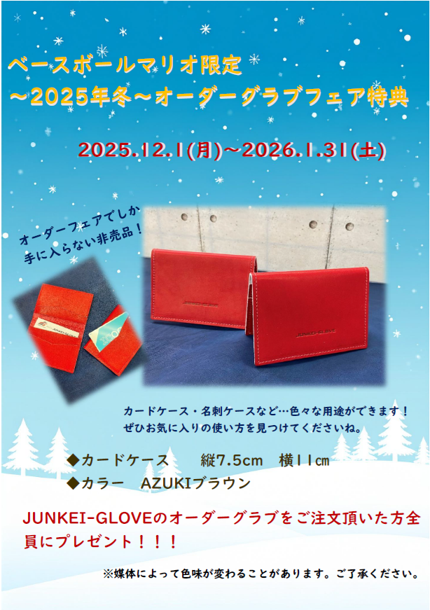 上記オーダーグラブフェア期間中、JUNKEI-GLOVEのオーダーグラブをご注文頂いた方全員にJUNKEI-GLOVEオリジナルカードケースをプレゼントします!